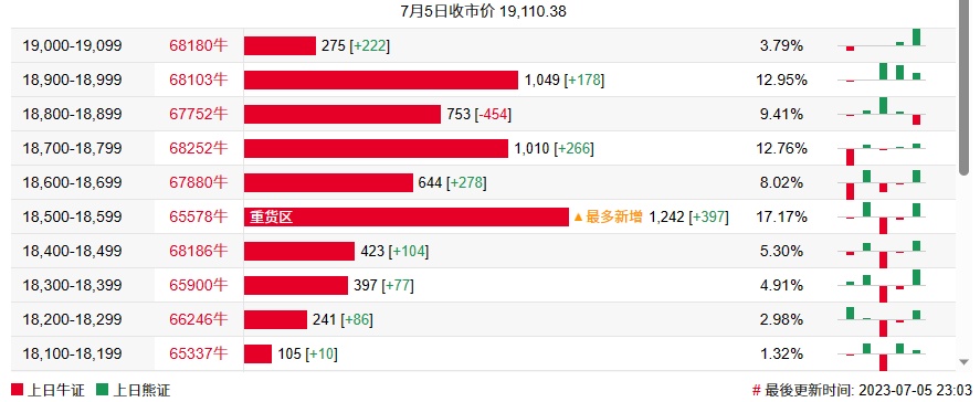 牛证街货重货区18500-18599,该区间最新牛证数量为1242张,较上一交易日增加397张;最多新增在同一区间。