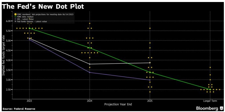 6月14日结束的FOMC会议公布,FOMC全体投票委员一致投票赞成保持政策利率不变,但点阵图显示,三分之二的联储官员预计今年利率高于5.5%、意味着至少年内两次加息25基点;联储官员在经济展望中将利率峰值的预期中位值提高50个基点至5.6%,高于经济学家和投资者预期的水平。