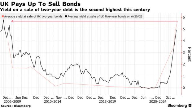 智通财经APP获悉,英国周三标售价值达40亿英镑(约合51亿美元)的2025年到期的金边债券,得标利率为5.668%,为2007年6月以来的最高水平。这表明,在加息一年多之后,政府必须提供更高的回报来吸引投资者。