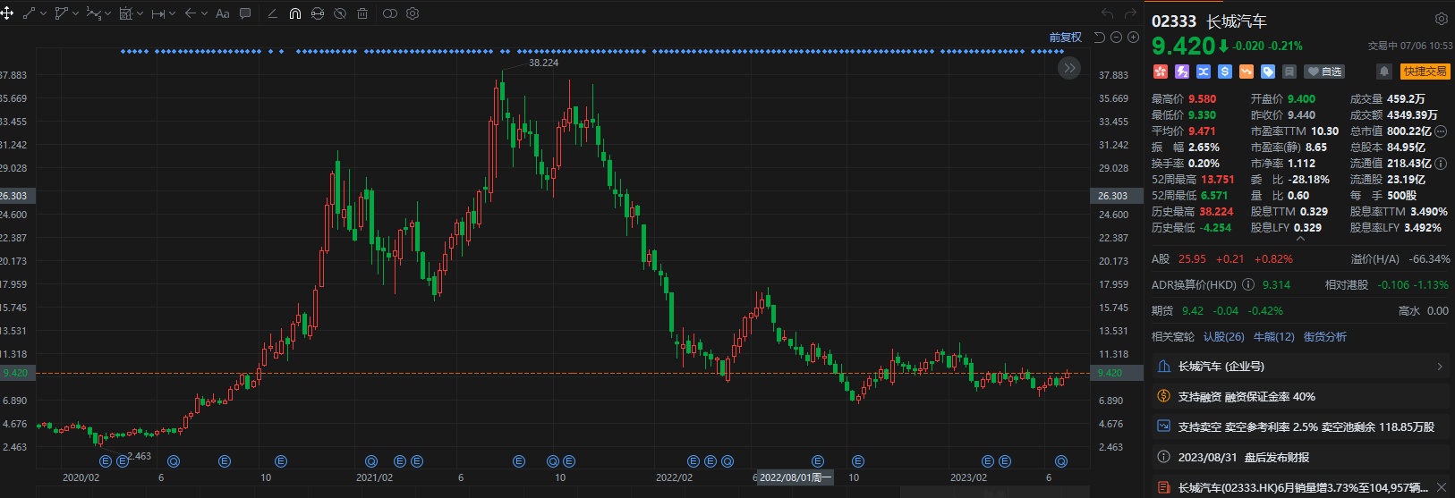 智通财经APP获悉,7月5日,长城汽车(02333)发布6月产销快报,本月销量104,957辆,同比增长3.73%,1-6月累计销量519226辆,同比增长0.14%。6月海外销售25010台,1-6月累计销售123930台。6月新能源车销售26669台,同比增长达110.1%,再创新高。1-6月累计销售93225台。二级市场方面,长城汽车股价表现不佳。截至发稿,长城汽车报9.42港元下跌0.21%,自21年触高点38.224港元以来跌超75%。