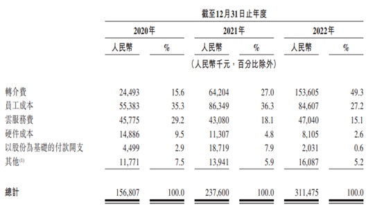 究其原因,公司认为亏损与其为数字精准营销服务向营销代理支付的巨额转介费以及用于支持公司不断扩张的业务运营的员工成本不无关系。细分来看,2020-2022年,该公司销售成本中转介费由2449.3万元激增至1.53亿元,员工成本亦由5538.3万增长至8460.7万元。