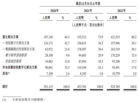 近三年内,数据驱动的智能解决方案收入大幅增长,该业务分部分别实现营收0.63亿元、1.79亿元和2.64亿元,占总营收比重从同期的21.6%大幅提升至50.1%。从中似乎也透露一个讯息:尽管公司以财税数字化解决方案起家,但站在当下时点,这已经不再是公司业务中最赚钱的部分。