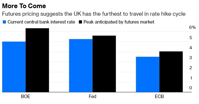 而英国的形势尤其严峻。期货市场预计英国央行的利率将达到6.3%的峰值,相比之下,美联储的利率峰值为5.6%,欧洲央行的利率峰值略高于4%。但正如RBC Bluebay资产管理公司首席投资官Mark Dowding所说的那样:“如果你做得太过,你会重创房地产市场,最终导致英国金融危机和滞胀。”