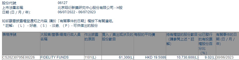 智通财经APP获悉,香港联交所最新资料显示,6月30日,富达基金增持昭衍新药(06127)6.13万股,每股作价19.5086港元,总金额约为119.59万港元。增持后最新持股数目为1073.06万股,最新持股比例为9.02%。