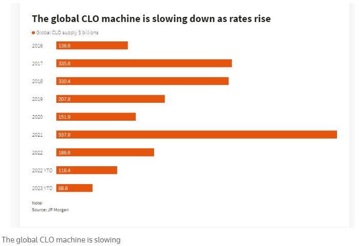 专业资产管理公司在2021年创造了价值超过5000亿美元的CLO,这一年是新冠疫情爆发后大规模货币刺激的一年。摩根大通的数据显示,今年上半年,有近690亿美元的公司发行或再融资,比2022年同期下降了41%。