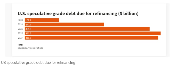 标普补充称,那些债务被视为垃圾级的现金流较弱的公司,其浮动利率债务的平均利率已经达到13年来的最高水平。标普估计,在全球CLO贷款池中占主导地位的具有投机信用评级(即垃圾债)的美国公司,到2024年底需要再融资约3540亿美元的债务,然后在2025年至2026年再融资8130亿美元。
