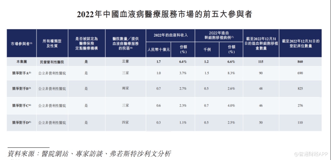 按2022年的造血干细胞移植病例数计算,公司是中国第二大的造血干细胞移植参与者,市场份额为6.6%,且在中国的造血干细胞移植服务市场中,于2022年公司是中国最大的异基因造血干细胞移植参与者,市场份额为9.4%,第二大半相合造血干细胞移植参与者,市场份额为10.2%。就2022年血液病特检服务产生的收入而言,公司还是该项服务的中国第三大提供商,市场份额为7.8%。