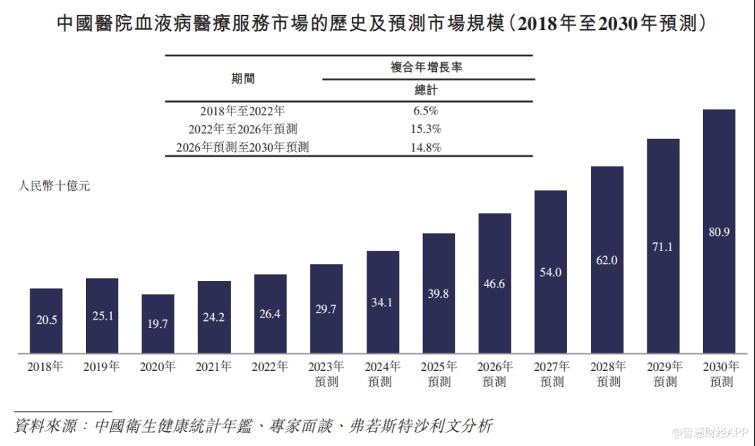 与之对应的是,中国的血液病医疗服务市场正处于发展的初期阶段,目前呈现快速增长势头。中国血液病医疗服务的总市场规模从2018年的205亿元增长至2022年的264亿元,复合年增长率为6.5%。预期将自2022年按15.3%的复合年增长率进一步增长至2026年的466亿元,及自2026年按14.8%的复合年增长率增长至2030年的809亿元,超过同期中国整体医疗服务市场的增长。
