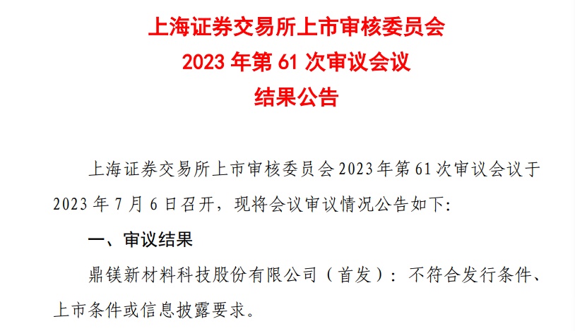 智通财经APP获悉,7月6日,上交所上市审核委员会2023年第61次审议会议结果公告,鼎镁新材料科技股份有限公司(首发)未通过。由此,鼎镁科技也成为全面注册制下首单主板IPO被否案例。