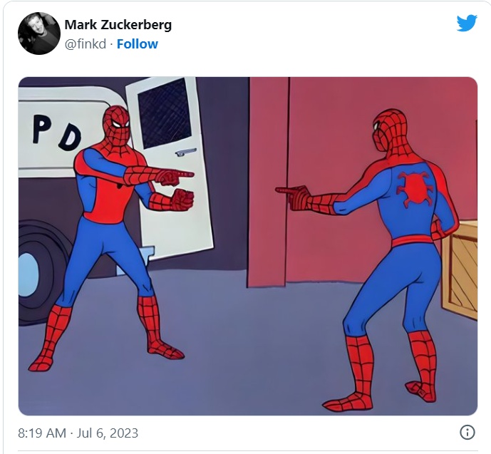 Threads被市场认为是对马斯克拥有的这家陷入困境的社交媒体平台最有力的威胁。几个小时后,扎克伯格在推特上发布了一张一模一样的蜘蛛侠对峙的照片。