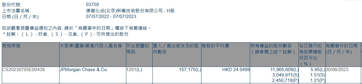 智通财经APP获悉,香港联交所最新资料显示,6月30日,小摩减持康龙化成(03759)15.7175万股,每股作价24.0499港元,总金额约为378.00万港元。减持后最新持股数目约为1196.56万股,最新持股比例为5.95%。