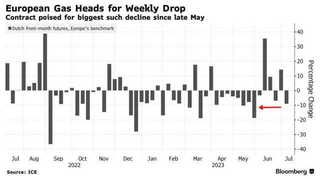 区域储存设施的利用率超过78%,远高于季节性平均水平,部分原因是今年早些时候液化天然气的涌入。这有助于抵消挪威停电、交易员押注和热浪推动的近期波动。