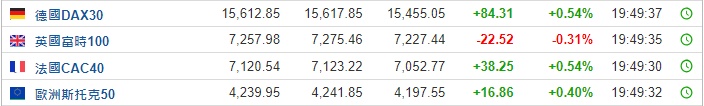 2. 截至发稿,德国DAX指数涨0.54%,英国富时100指数跌0.31%,法国CAC40指数涨0.54%,欧洲斯托克50指数涨0.40%。