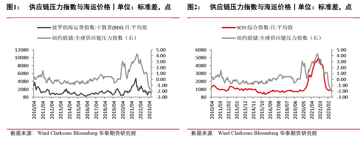 然而如前所述,进入2023年后,集运市场供给增速快于需求增速,高运价已是难以为继。据了解,纽约联储全球供应链压力指数自2021年12月的历史高位大幅下行,2023年5月的最新数据为-1.71.刷新阶段新低。而过往供应链压力指数与海运价格具有较大的正相关性,目前看供应链端对于海运价格的溢价效应持续走弱。