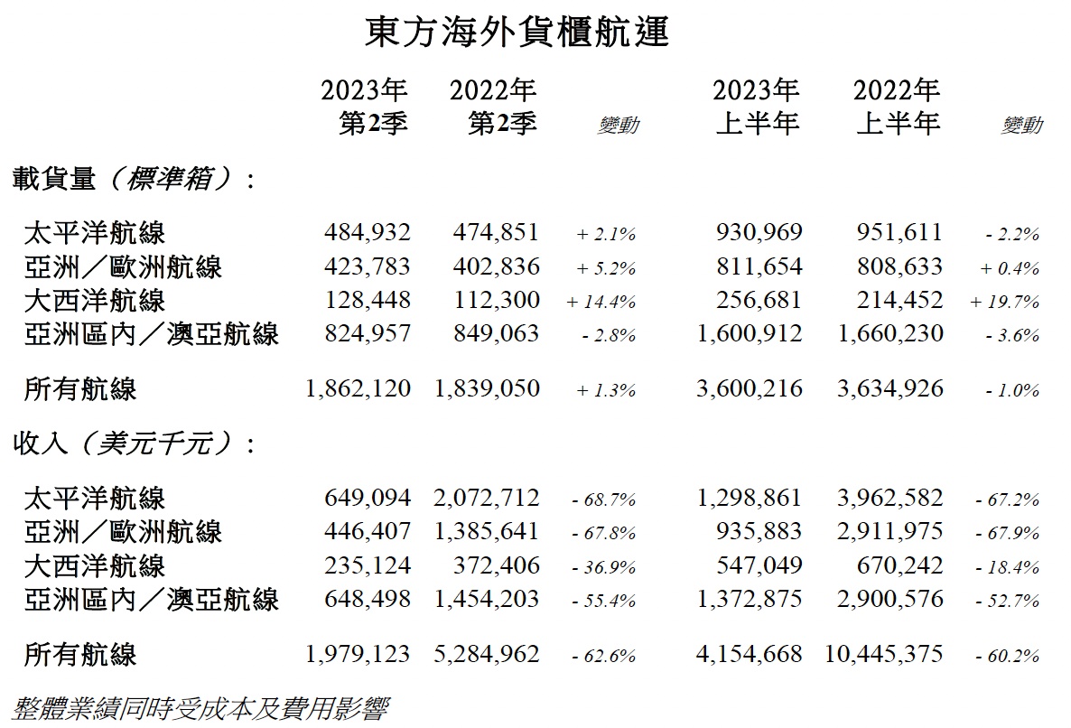 日前,东方海外国际(00316)公布了第2季度营运概要。公告显示,23Q2期间公司实现收入19.79亿美元,同比下降62.6%;总载货量上升1.3%,运载力上升8.7%;整体运载率较上年同期下滑5.9%,每个标准箱的整体平均收入同比锐减63%。
