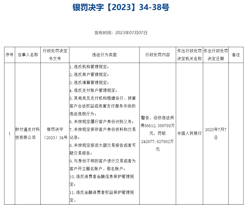 财付通支付科技有限公司也受到了央行罚单,央行罚单显示,财付通支付科技有限公司被警告,没收违法所得56612.388789万元,罚款242677.827882万元,总金额接近30亿元。