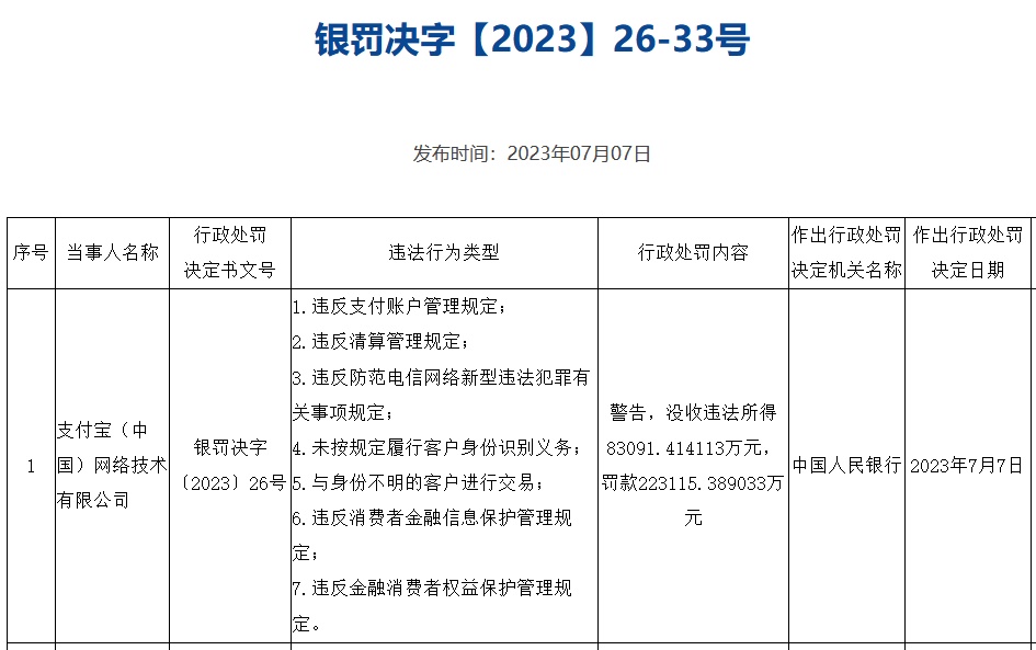 智通财经APP获悉,7月7日,央行对支付宝、财付通开出巨额罚单。其中,针对蚂蚁集团的罚单显示,支付宝(中国)网络技术有限公司被警告,没收违法所得83091.414113万元,罚款223115.389033万元,总金额超30亿元。另一家第三方支付巨头财付通也收到了央行罚单,没收违法所得56612.388789万元,罚款242677.827882万元,总金额接近30亿元。