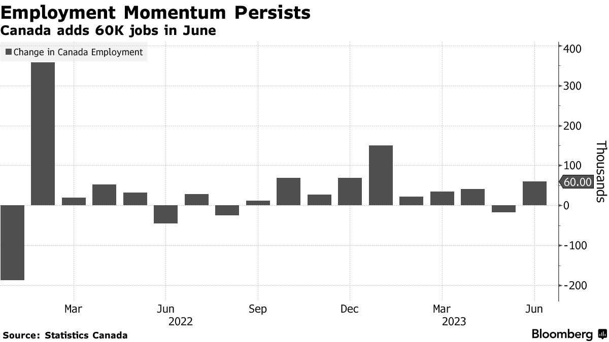 然而,加拿大总体通胀率已从去年8.1%的峰值大幅放缓至5月份的3.4%。这使得下周的利率决定变得更加难以预料。就业报告是政策制定者依赖的最后一个重要数据,在这份报告发布之前,经济学家们对7月加息或9月加息持空完全不同意见。