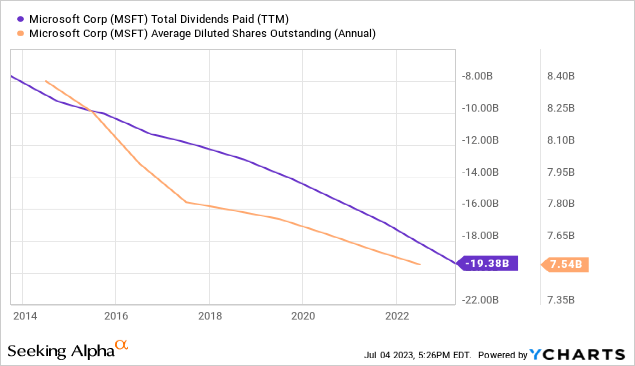 微软继续通过回购和股息向股东返还越来越多的资本。这种趋势可能会在未来十年持续下去,除非微软看到有机会以比目前更高的速度重新投资到该业务。