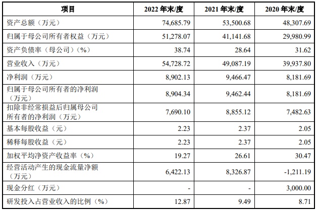 财务方面,于2020年、2021年、2022年,公司实现营业收入分别为3.99亿元、4.91亿元、5.47亿元,其中,公司实现净利润分别为8181.69万元、9466.47万元、8902.13万元。