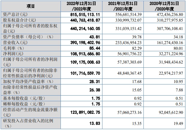 财务方面,于2020年、2021年、2022年,公司实现营业收入分别为1.61亿元、2.33亿元、3.9亿元。其中,公司实现净利润分别为3227.12万元、5690.18万元、10891.37万元。