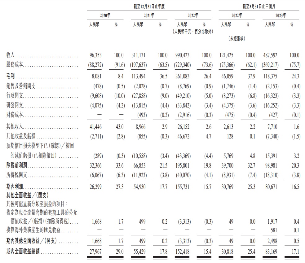 财务方面,截至2020年、2021年及2022年12月31日止年度以及截至2023年3月31日止三个月,药明合联的收益获得强劲增长,分别为人民币9635.3万元、人民币3.11亿元、人民币9.90亿元及人民币4.88亿元。同期,分别录得净利润人民币2629.9万元、人民币5493.0万元、人民币1.56亿元及人民币8067.1万元。
