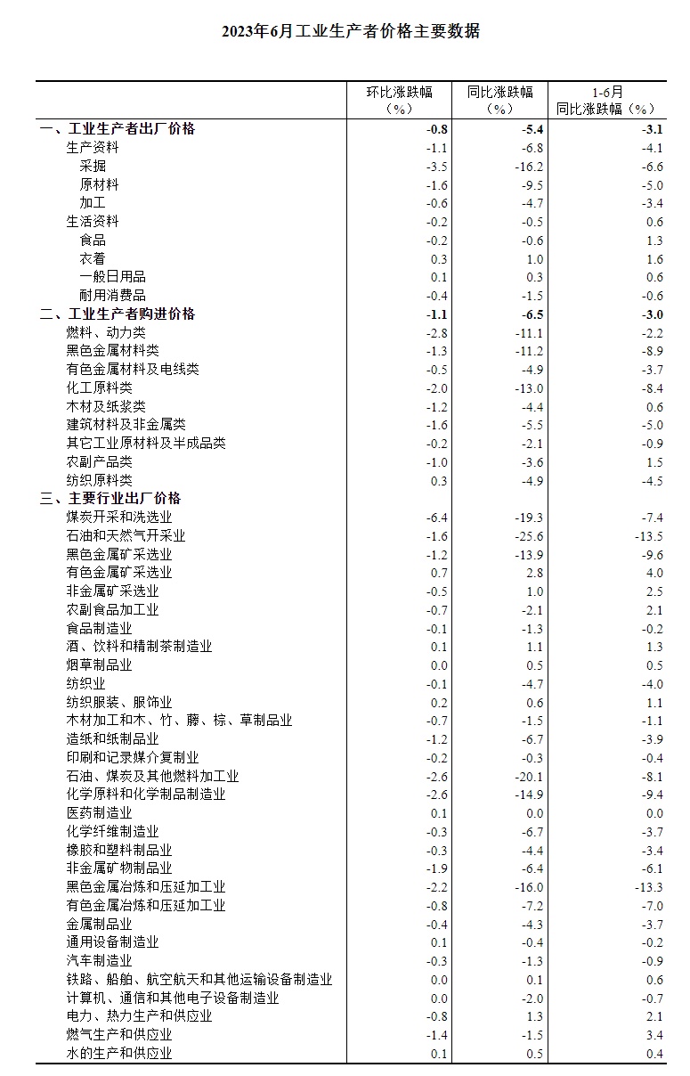 2023年6月份,全国工业生产者出厂价格同比下降5.4%,环比下降0.8%;工业生产者购进价格同比下降6.5%,环比下降1.1%。上半年,工业生产者出厂价格比上年同期下降3.1%,工业生产者购进价格下降3.0%。