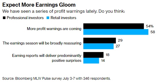 德银策略师表示,过去10年财报季通常对股市有利,但在MLIV Pulse的346名受访者中,55%的人表示,即将到来的财报季将对股市不利。
