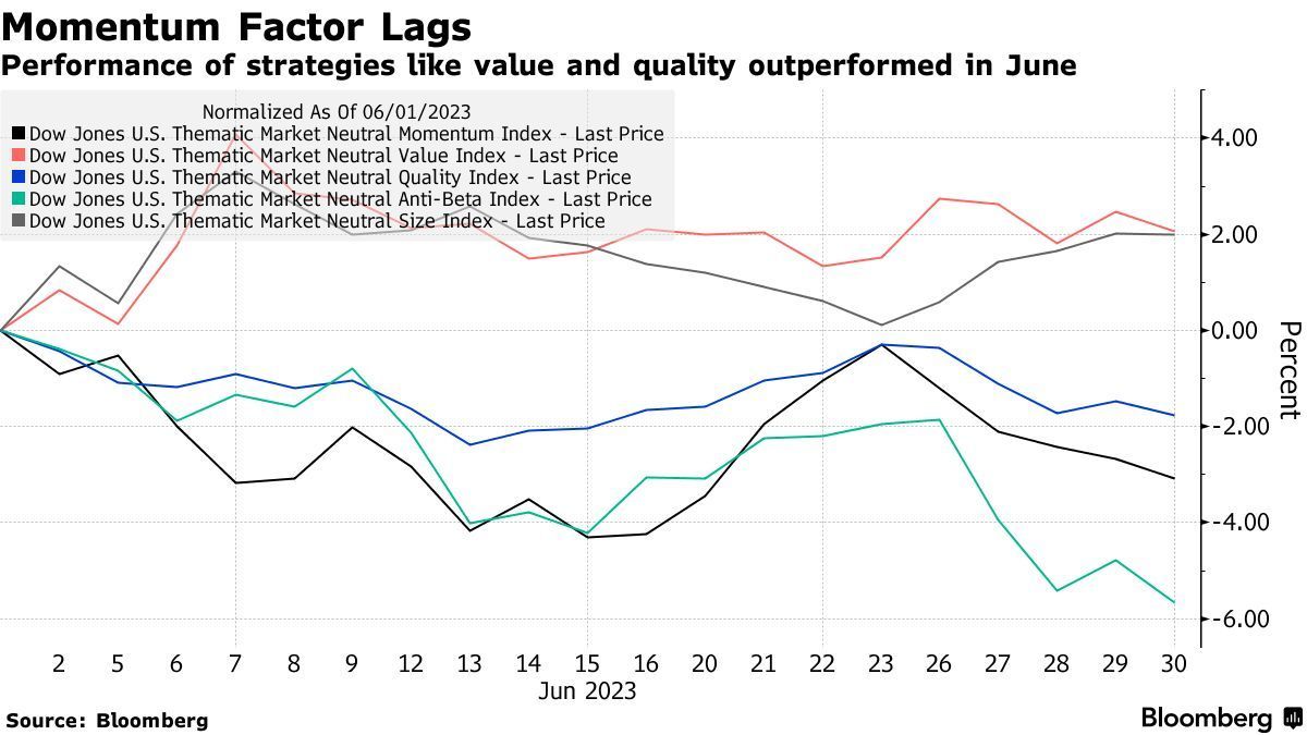 此外,基于因子的指数——一种基于特定特征锁定股票的量化投资工具,其表现也预示着美股市场广度大幅改善。今年6月,道琼斯美国主题市场中性动量指数(Dow Jones U.S. Thematic Market Neutral Momentum Index)表现逊于其他较流行的量化策略,包括以廉价股为目标的价值策略。这一中性动量指数根据近期回报率买入股市赢家。年初至今,尽管这两个因素的表现都不是特别好,但情况正好相反。