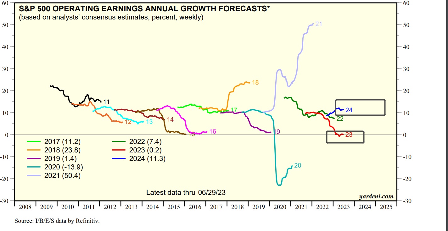 来自投资机构Yardeni的统计数据显示,分析师们普遍预期自今年第三季度开始,标普500指数的整体利润开始呈现回升态势,并且在第四季度大幅增长。从更长时间线来看,分析师们普遍预期2023年每股营业利润预期已由此前的负值趋于开始缓慢回升,2024年则有望重新实现10%以上高增速。市场往往提前半年左右的时间定价趋势线,但是,一些美股市场的"看涨信仰者们”可能已开始为极度乐观的利润趋势做准备工作。