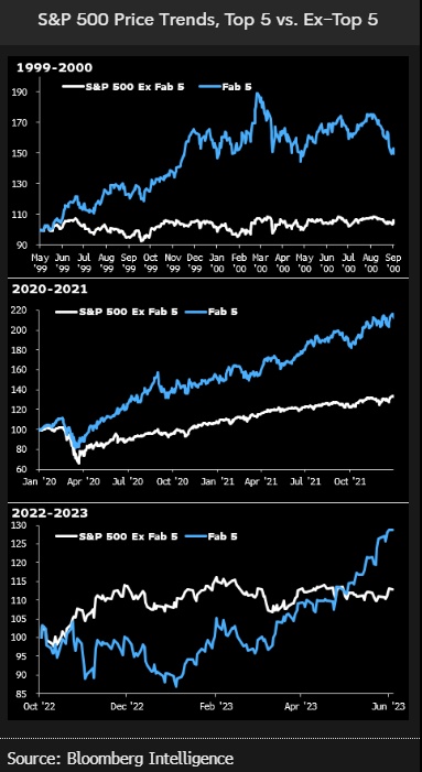 BI的统计数据显示,在截至6月份的这三个月中,标普500指数中市值排名前五的股票——包括苹果、微软和Alphabet——分析师们普遍预计将实现16%的整体利润同比增幅。相比之下,分析师们预计标普500指数成分股整体利润可能同比收缩超过8%,因此今年第二季度有可能是标普500指数成分公司的“业绩底”。
