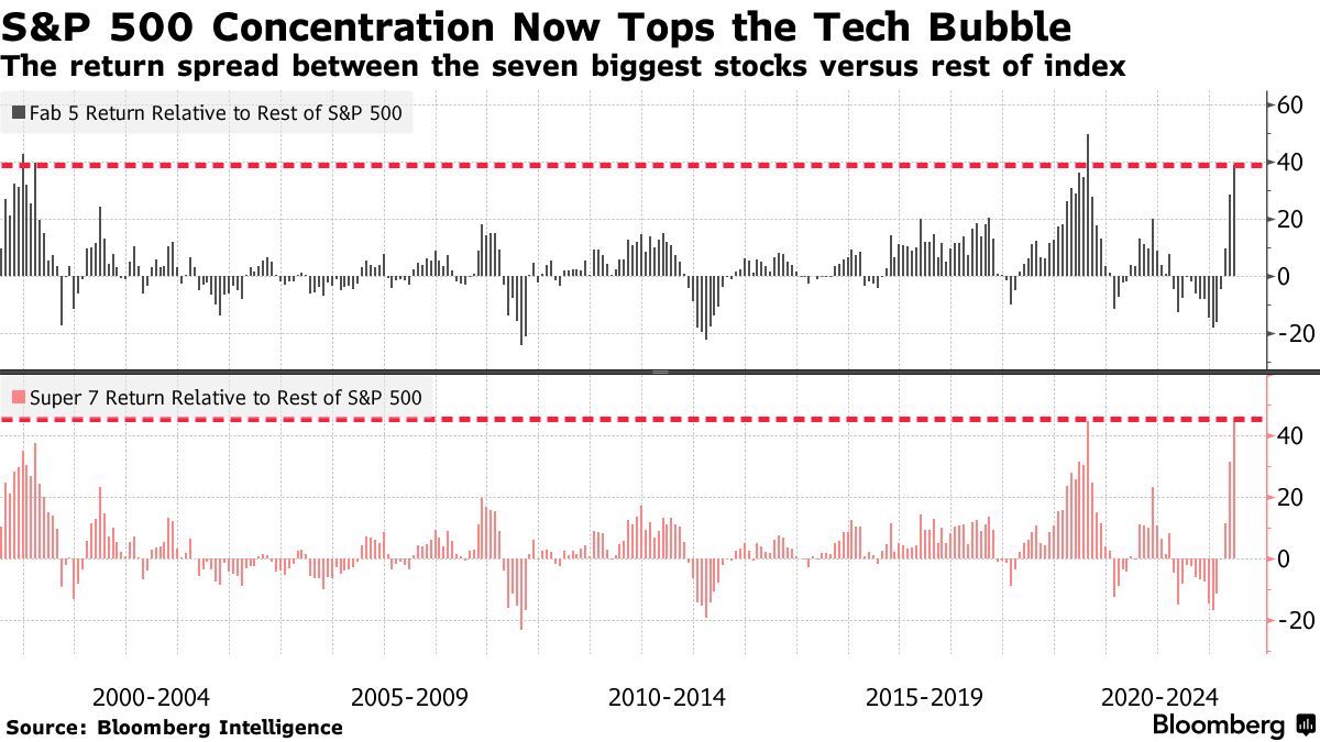 标普500指数集中度超过科技股泡沫——七大成分股与指数其他成分股回报率之差