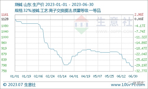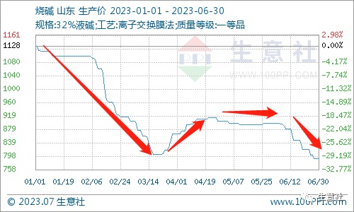 智通财经APP获悉,7月10日,据生意社商品行情分析系统,2023年上半年烧碱价格整体弱势。年初市场均价为1128元/吨左右,6月30日烧碱价格792元/吨左右,半年度价格下跌近30%。展望后市,国内烧碱价格僵持为主,市场行情整体弱势运行。虽然7月份有数家企业检修,但是前期检修企业陆续恢复生产,烧碱供应仍旧较为充足。且下游氧化铝企业偏稳运行,现货成交较少,采购订单一般,所以后期烧碱价格不容乐观,或维持弱势行情为主,具体关注下游市场需求。