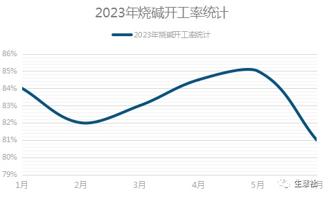 供应端:从烧碱开工率图和检修情况来看,2023年上半年烧碱企业开工率多维持在80%-85%之间,且有烧碱企业检修,但是因为下游缺乏利好支撑价格仍弱势运行。此外有数据对2023年1-5月全国烧碱产量进行监测统计显示:2023年5月全国烧碱(折100%)产量341.28万吨,同比下降0.3%,2023年1-5月全国烧碱产量为1693.37万吨,累计增长4.2%。