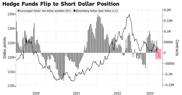智通财经APP获悉,对冲基金自3月以来首次转向整体看空美元,押注美联储接近加息周期的尾声。根据美国商品期货交易委员会(CFTC)数据,在截至7月7日的一周内,杠杆投资者转为美元净空头头寸的数量为20091份,一周前为5196份合约。
