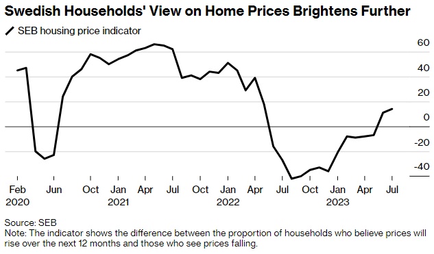 智通财经APP注意到,瑞典最大银行的一项调查显示,瑞典家庭对该国房地产市场的前景变得更加乐观。根据周一发布的数据,瑞典最大规模银行SEB AB编制的房价指数在7月份上升了3个点,达到14点,而上个月则上升了18点。
