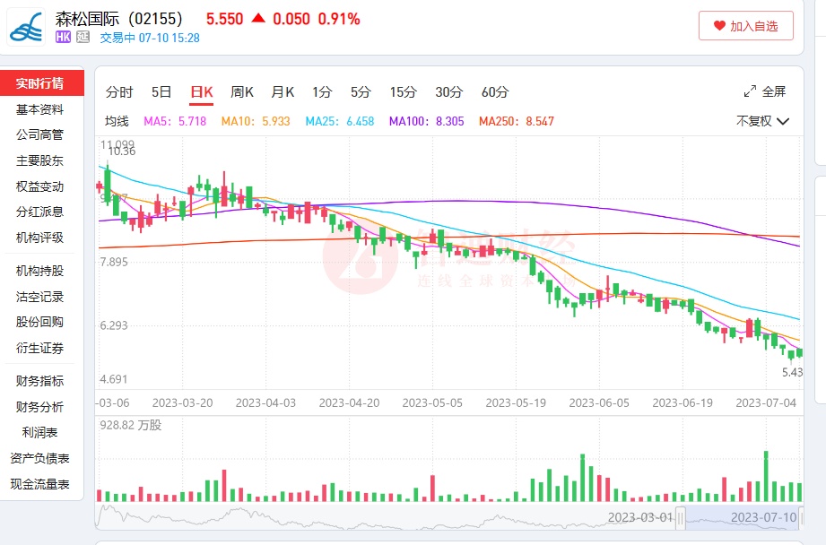 在宣布若干董事于近日选择行使购股权事项,并于其后出售部分股份后,森松国际(02155)遭遇二级市场投资者毫不留情的“用脚投票”,7月7日盘中低见5.43港元,创2022年3月以来新低。