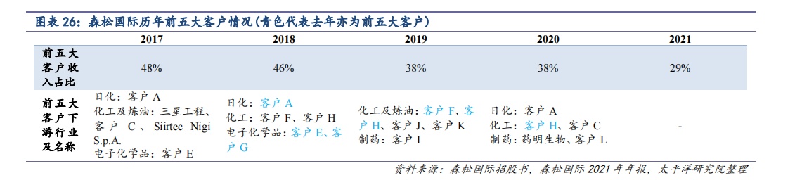从财报来看,公司的客户群以各下游行业的头部企业为主,数量高达数百家,在2017-2021年前五大客户创收在公司总收入中占比 29-48%,对总收入的影响较大,公司每年的前五大客户中均有一部分不同于上一年度,且所属的下游行业在每年有所不同。简言之,对公司总收入影响最大的客户和其所属下游行业始终处在变化中。