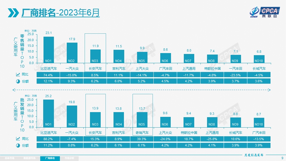 4) 车企:6月新能源乘用车企业总体走势较强,比亚迪纯电动与插混双驱动夯实自主品牌新能源领先地位;以长安、上汽、广汽、吉利等为代表的传统车企在新能源板块表现尤为顽强。在产品投放方面,随着自主车企在新能源路线上的多线并举,市场基盘持续扩大,厂商批发销量突破万辆的企业达到13家(环比增1家,同比少3家),占新能源乘用车总量82.7%(上月82.1%,去年同期83.6%)。其中:比亚迪251,685辆、特斯拉中国93,680辆、广汽埃安45,013辆、吉利汽车38,566辆、长安汽车36,622辆、理想汽车32,575辆、上汽通用五菱30,441辆、上汽乘用车27,449辆、长城汽车26,643辆、零跑汽车13,209辆、哪吒汽车12,132辆、蔚来汽车10,707辆、奇瑞汽车10,573辆。