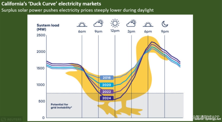 当太阳能发电量达到最大值时,电力生产商必须适应更加便宜的电价,电价就像鸭子的腹部一样向下倾斜,但一旦太阳落山,他们必须提高其他来源的发电量,电价就形成了类似鸭子脖子的曲线。