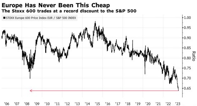 今年,在美国股市上涨的同时,欧洲股市的涨幅陷入停滞,原因是对利率上升的担忧打压了股市。根据12个月预期市盈率,斯托克欧洲600指数目前的股价较标普500指数有36%的折价。这两个基准股指之所以出现分化,是因为美股上半年的上涨主要是由苹果(AAPL.US)、微软(MSFT.US)和英伟达(NVDA.US)等科技巨头带来巨大涨幅。