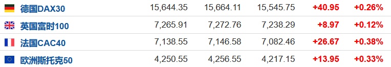 2.截至发稿,德国DAX指数涨0.26%,英国富时100指数涨0.12%,法国CAC40指数涨0.38%,欧洲斯托克50指数涨0.33%。