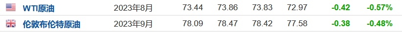 3.截至发稿,WTI原油跌0.57%,报73.44美元/桶。布伦特原油跌0.48%,报78.09美元/桶。