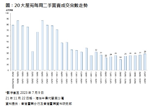 智通财经APP获悉,7月10日,香港置业研究部董事王品弟表示,据该行前线分行所录得的数字显示,综合过去一星期(7月3日至7月9日)香港20大主要屋苑二手买卖录29宗成交,较前周(6月26日至7月2日)的27宗增加约7.4%。香港政府于上周五(7月7日)放宽自住物业最高按揭成数及按揭保险计划,有利二手市场气氛;值得留意的是,上周20大屋苑交投表现尚未完全反映。
