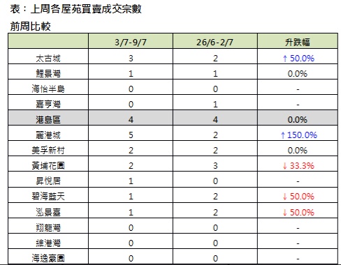 而港岛区4个指标屋苑录4宗成交,按周持平;当中太古城录3宗成交,按周增加1宗;相反,嘉亨湾由前周录1宗成交减少至上周零成交。