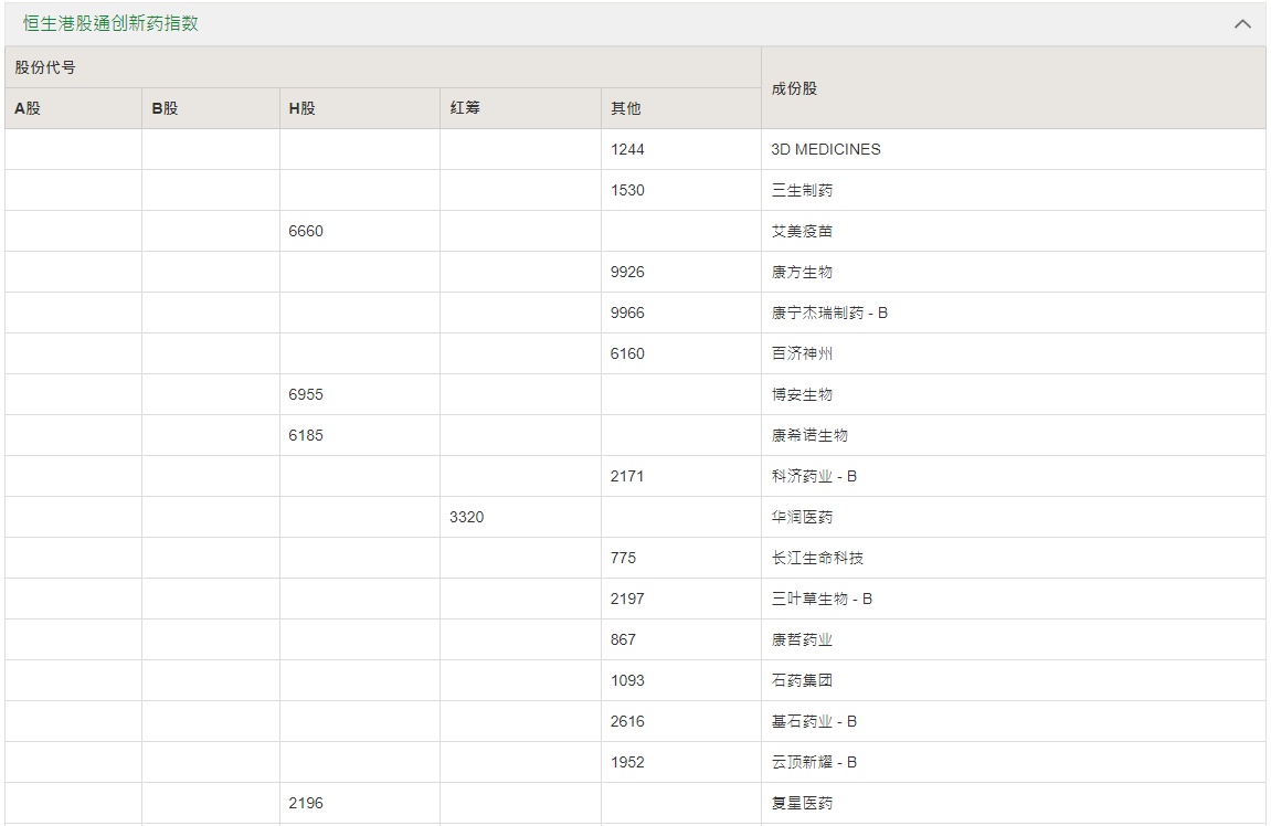 智通财经APP获悉,7月10日,恒生指数有限公司推出恒生港股通创新药指数,新指数每隔两秒计算及作即时发布。恒生港股通创新药指数反映可经港股通买卖,业务与创新药研究、开发及生产相关的香港上市公司之表现。截至今日16:08,该指数跌0.36,跌0.02%。目前,恒生港股通创新药指数共有40只成份股,其中包括康方生物(09936)、复星医药(02196)、三生制药(01530)、石药集团(01093)、基石药业-B(02616)、药明生物(02269)等。