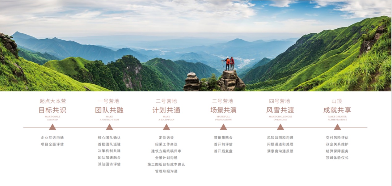 “M登山模型”将代建服务的全流程比作登山之旅:包含六大营地、23个服务节点动作,指导代建团队在服务全过程中,与委托方建立牢固的信任关系,以规范化、流程化的专业服务,确保项目经营兑现度,提升客户体验和满意度。