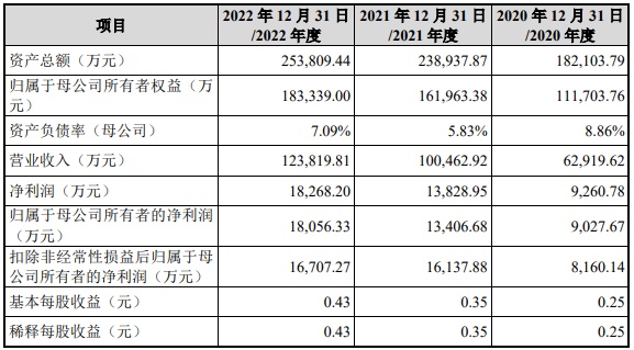 财务方面,于2020年、2021年、2022年,公司实现营业收入分别为6.29亿元、10.05亿元、12.38亿元。其中,公司实现净利润分别为0.93亿元、1.38亿元、1.83亿元。