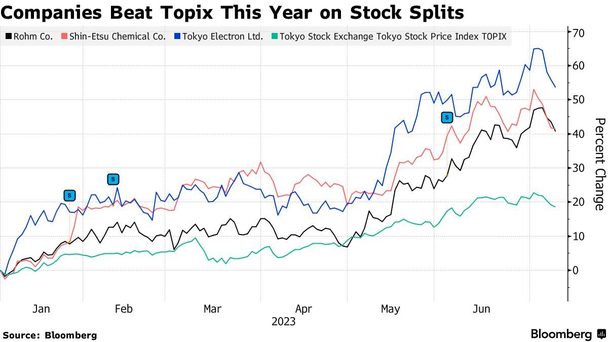 智通财经APP了解到,近期进行股票分拆的日本公司股价表现优于日股大盘,表明全球投资者蜂拥而至,抢购这些进行拆股之后的股价更加便宜的“日特估”股票。根据机构收集的数据,截至目前,包括芯片设备制造商罗姆(Rohm Co)和全球最大规模硅片制造商信越化学(Shin-Etsu Chemical Co)在内的80多家日本公司已经宣布2023年拆股(大部分已完成拆股),几乎是一年前的两倍,也是五年来最多的一次。