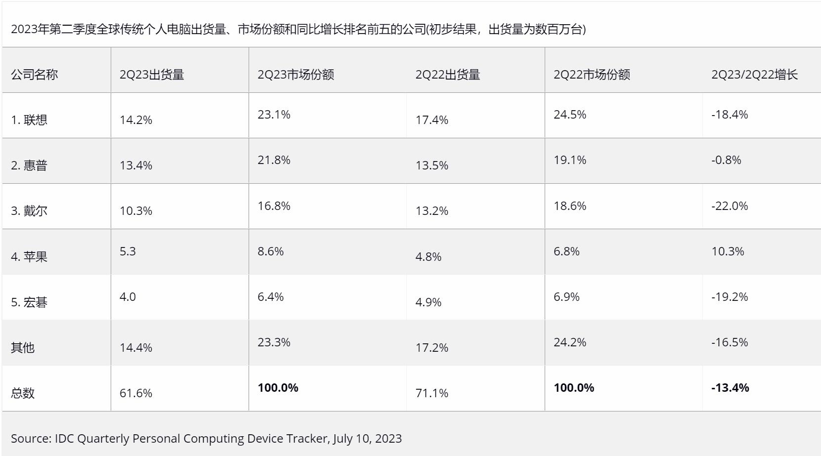 IDC指出,整体需求疲软导致库存水平高于预期水平,包括渠道层面的成品系统以及供应链。到目前为止,没有一家PC厂商能够幸免于市场带来的挑战。除了苹果和惠普公司,所有主要厂商在本季度都经历了两位数的下滑。